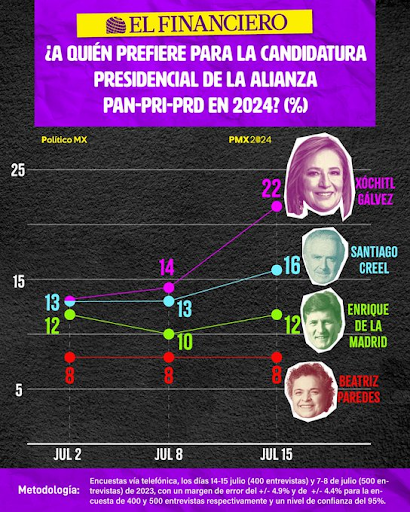 Marcelo Ebrard es la "corcholata" morenista que más incógnitas genera sobre su futuro: si se quedará en el partido, aunque la encuesta interna no le favorezca, o si renunciará para competir con otros colores, como los de Movimiento Ciudadano. Diversas fuentes aseguran que en días recientes el excanciller habría solicitado directamente a Dante Delgado soportar todas las presiones y no sumarse al Frente Amplio por México, ya que sigue abierta la posibilidad de virar y competir abanderado por MC, lo cual se definirá hasta septiembre, apenas unos días u horas antes de la encuesta final (…) Ebrard es el aspirante que, además de concentrar en la contienda buen parte del voto duro de Morena, podría sumar otra gran cantidad de votos de la clase media y de la oposición moderada (…) Xóchitl Gálvez lo reconoce: a la "corcholata" que más teme en su eventual candidatura a la Presidencia es al exjefe de Gobierno y excanciller, Marcelo Ebrard .