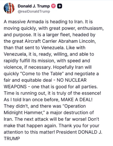 Ojalá Irán se siente pronto a la mesa y negocie un acuerdo justo y equitativo —sin armas nucleares— que beneficie a todas las partes. ¡El tiempo se acaba, es realmente esencial! Como ya le dije a Irán: ¡LLEGUEN A UN TRATO! escribe Donald Trump.