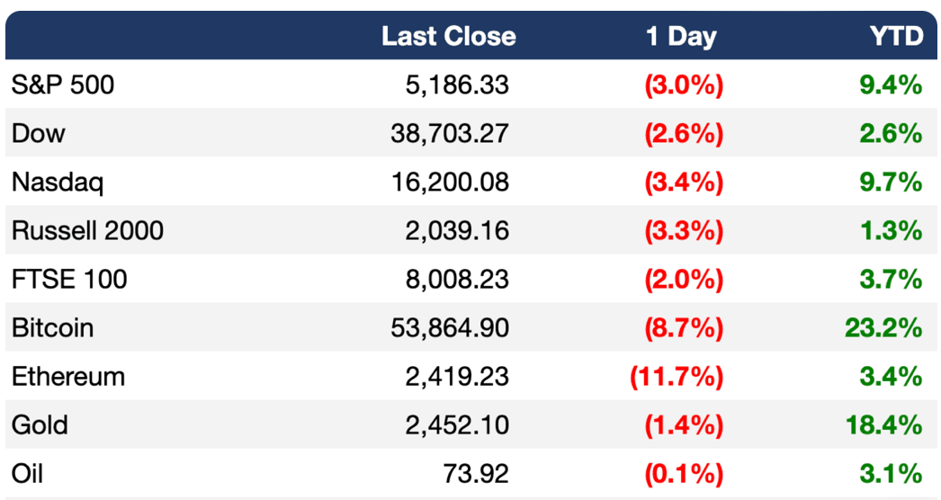 Los mercados bursátiles mundiales se desplomaron ayer por preocupaciones sobre una desaceleración de la economía estadounidense / Estados Unidos representa casi una cuarta parte del producto interno bruto mundial, y puede influir significativamente en los mercados globales / El VIX, una medida de la volatilidad esperada conocida como el indicador del miedo de Wall Street, subió brevemente a su nivel más alto desde los primeros días de la pandemia / Muchos inversionistas están reposicionando sus carteras para una recesión / Muchos economistas creen que la Reserva Federal ha fallado al no recortar las tasas la semana pasada / Los pilares que habían apuntalado las ganancias de los mercados financieros durante años (incluida una imparable economía estadounidense y la revolución de la IA) han sido sacudidos / Estados Unidos y sus aliados están trabajando para evitar un ataque iraní contra Israel y evitar una guerra regional más amplia / Irán mantiene en vilo a Oriente Medio / Gran Bretaña ha estado convulsionada por la violencia durante la última semana cuando multitudes que lanzaban consignas antiinmigrantes e islamófobas se enfrentaron con la policía / La vicepresidenta Kamala Harris se convirtió oficialmente ayer en la candidata demócrata a la presidencia / Harris prepara un mitin de Filadelfia para presentar a su compañero de fórmula / La primera ministra de Bangladesh renunció en medio de protestas antigubernamentales / Google perdió el caso antimonopolio relacionado con su motor de búsqueda / Elon Musk demandó a OpenAI y Sam Altman, alegando que ignoraron la misión de la organización de desarrollar IA en beneficio de la humanidad / OpenAI está dividido entre su compromiso de transparencia y el riesgo de perder usuarios que plagian con su IA, ya que una herramienta anti-trampas efectiva podría disuadir a muchos de ellos / Nueva herramienta es desarrollada para rastrear cómo los compuestos psicodélicos comienzan a afectar las neuronas minutos después de la ingestión.