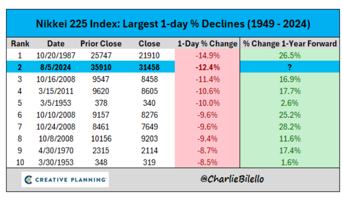 El índice Nikkei 225 de Japón se desplomó un 12%, su mayor caída desde 1987, en reacción al aumento del desempleo y la desaceleración de la creación de empleos en Estados Unidos reportados el viernes. Los inversionistas interpretaron que una desaceleración económica en Estados Unidos presagia tiempos difíciles para las empresas japonesas. El panorama pesimista se agravó aún más por un yen más caro, y por la subida de la tasa de interés del banco central japonés que ocasionó una crisis en el “carry-trade”. (El carry trade es una estrategia de inversión que consiste en pedir prestado dinero en una moneda con una tasa de interés baja -como el yen japonés- y luego invertirlo en otra moneda con una tasa de interés más alta para obtener una ganancia del diferencial de tasas).