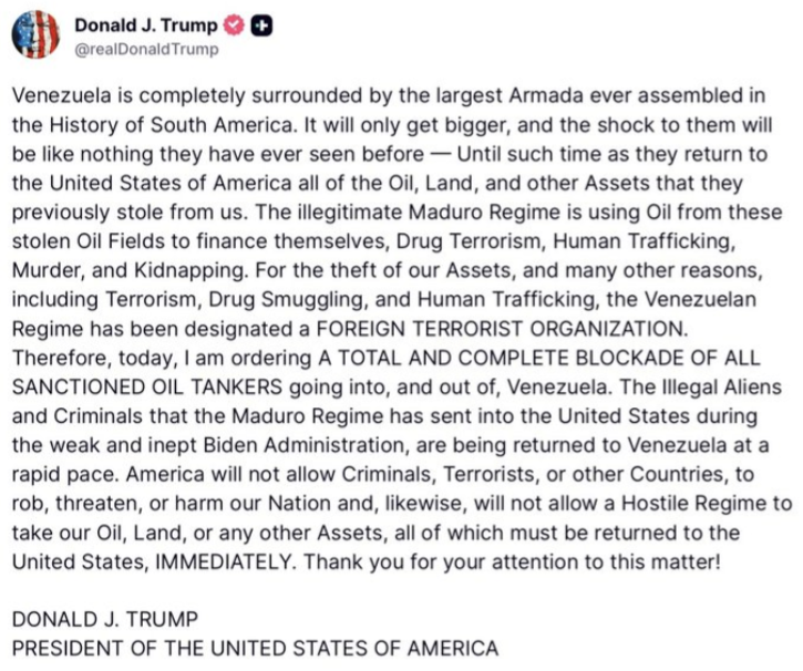 ▶️Trump ordena bloquear todos los buques petroleros de Venezuela, con los que se financia la dictadura de Maduro.
