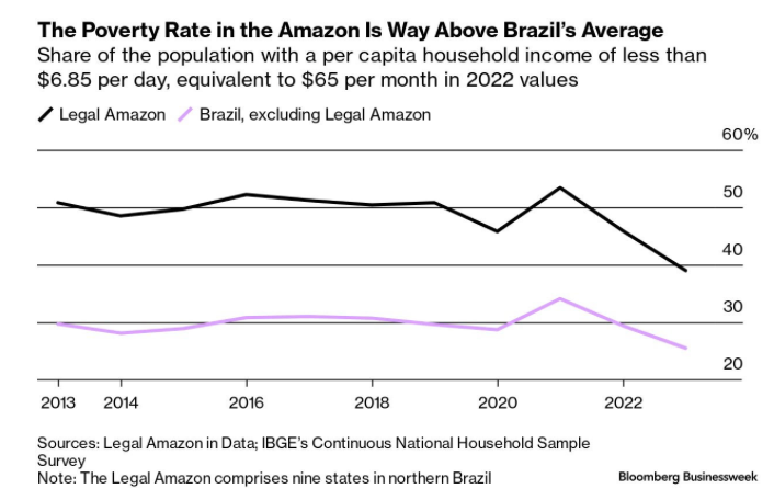En la región amazónica de Brasil, las personas están atrapadas en un ciclo vicioso en el que la deforestación genera pobreza, y la pobreza impulsa más deforestación. Más de una quinta parte de la selva tropical del país ha desaparecido, principalmente debido a la expansión del agronegocio. (BBG)
