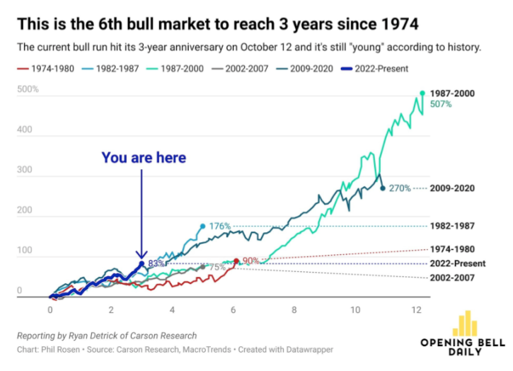 El índice S&P 500 acaba de cumplir tres años de mercado alcista, acumulando un avance del 83% desde su punto más bajo en octubre de 2022, cuando cotizaba en 3,577 puntos. Aunque algunos analistas advierten sobre valoraciones elevadas y comparaciones con la burbuja tecnológica, la historia sugiere que este ciclo aún es joven: los once mercados alcistas anteriores promediaron un rendimiento de 191% antes de agotarse. De acuerdo con Carson Research, solo una vez desde la Segunda Guerra Mundial un mercado alcista alcanzó su tercer aniversario sin llegar al cuarto, lo que sugiere que el impulso podría extenderse si se mantiene el entorno de estabilidad monetaria y optimismo en torno a la inteligencia artificial.