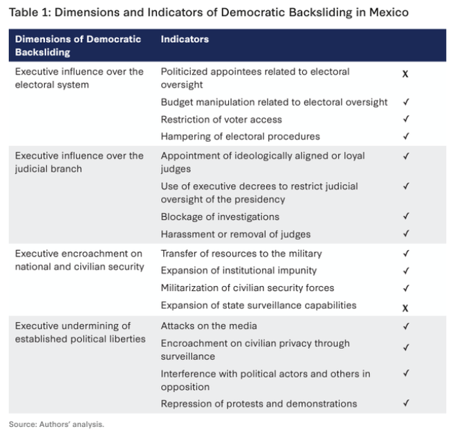 En un informe del “Center for Strategic & International studies” sobre el "fortalecimiento del poder ejecutivo" bajo el mandato de AMLO, se encontró que su gestión implicó un retroceso democrático en 14 de 16 indicadores. En apenas unas semanas, Claudia Sheinbaum ha continuado en el deterioro de prácticamente en todos esos puntos.