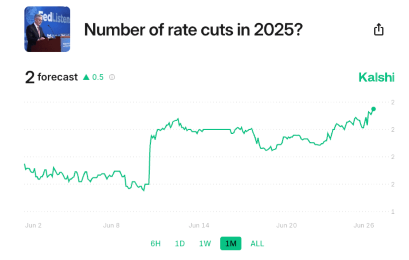 Las apuestas de los operadores ahora sitúan en 22.7 % la probabilidad de un recorte de 25 puntos base en julio, el doble que la semana pasada, y en 20.8 % la posibilidad de que las tasas bajen 50 puntos base para septiembre. Mientras tanto, la plataforma Kalshi refleja un incremento en las expectativas de dos recortes adicionales en 2025. Aunque Jerome Powell se mantiene cauto por la incertidumbre arancelaria, otros miembros de la Reserva Federal, como Christopher Waller y Michelle Bowman, ya abren la puerta a recortes, respaldados por la debilidad del empleo y cinco meses consecutivos de inflación por debajo de lo esperado. (OBD)