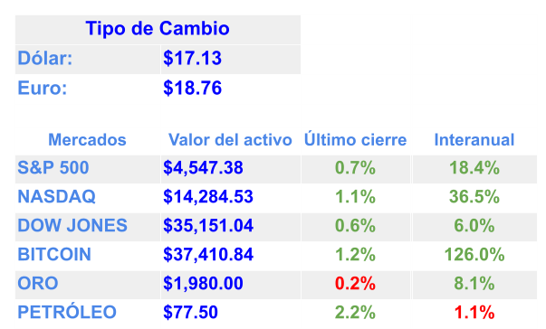 Está a punto de abrirse un nuevo frente en el conflicto entre Estados Unidos y China por los chips. Biden cambiará el enfoque hacia un escenario emergente de la competencia por la supremacía tecnológica / El recién elegido presidente de Argentina, Javier Milei, presentó una plataforma que priorizaba la dolarización, o el cambio de la moneda local por el dólar estadounidense. Con las elecciones en el retrovisor, Milei está ansioso por deshacerse de los pesos y hacer que llueva dólares / La dolarización es el equivalente económico a rezar un Ave María y ver que pasa. No hay garantía de que funcione, pero con una inflación del 143%, Argentina tiene que intentar algo. Otros países que se han dolarizado, como Ecuador y Panamá, han obtenido resultados mixtos / Los mercados bursátiles relacionados con América Latina subieron el lunes después de que se conociera la noticia de la victoria del derechista Javier Milei en las elecciones presidenciales del país. Milei, que abraza políticas “libertarias”, se ha comprometido a marcar el comienzo de una nueva era favorable a las empresas para el país / Incluso cuando persiste la presión y surgen preocupaciones sobre una reacción violenta entre algunos votantes demócratas, Biden ha dejado claro que no respalda un alto el fuego dada la amenaza actual que representa Hamás para Israel / Las candidatas presidenciales de Morena y el Frente Amplio por México, Claudia Sheinbaum y Xóchitl Gálvez, arrancaron con sus precampañas electorales este lunes / China está presionando a los bancos estatales para que aceleren los préstamos a promotores inmobiliarios privados en un intento por revivir el debilitado sector inmobiliario del país / Más del 75 por ciento del dinero extranjero que entró al mercado de valores chino en los primeros siete meses ha salido de nuevo / Un inversionista de Tesla afirmó que la junta directiva de la compañía de vehículos eléctricos debería suspender a Elon Musk por respaldar opiniones antisemitas en redes sociales / El ex director ejecutivo de OpenAI, Sam Altman, ha sido contratado para dirigir la nueva unidad interna avanzada de investigación de inteligencia artificial de Microsoft junto con el ex presidente de OpenAI, Greg Brockman / El elegido por la junta para reemplazar a Altman, el ex director ejecutivo de Twitch, Emmett Shear, es un conocido escéptico de la Inteligencia Artificial. Recientemente dijo que el riesgo de "perdición" que podría provocar la IA es tan aterrador que deberías "cagarte los pantalones" y un informe de las Naciones Unidas publicado ayer advierte que la Tierra está en camino de superar un umbral crítico de calentamiento global en la próxima década.