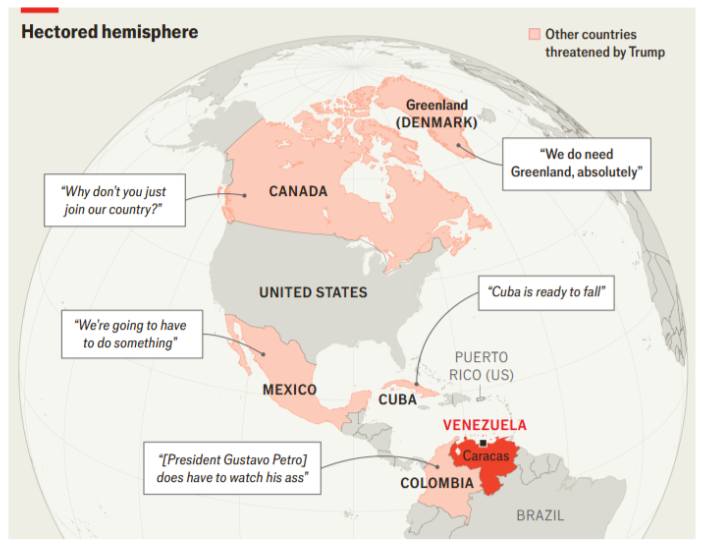 Donald Trump considera que, tras la captura de Nicolás Maduro y el colapso interno de la isla, Cuba podría enfrentar su mayor riesgo de quiebre en décadas, aunque la historia sugiere cautela sobre un desenlace inmediato / Estados Unidos busca imponer su hegemonía en América Latina tras la captura de Nicolás Maduro, pero hay un riesgo es que la intervención en Venezuela detone inestabilidad regional y termine debilitando la credibilidad de ese país / Donald Trump afirmó que Estados Unidos controlará por tiempo indefinido la gestión petrolera de Venezuela, tras elogiar al gobierno interino y ordenar la incautación de un petrolero ruso / Donald Trump promete expandir el petróleo venezolano con inversión estadounidense, pero la inestabilidad política (incertidumbre), la infraestructura deteriorada y el nacionalismo interno ponen en duda la viabilidad del plan / Volodímir Zelenski entrará a negociar con enviados de Donald Trump los temas más sensibles del conflicto, mientras Washington prepara nuevas sanciones bipartidistas contra Rusia / Si América Latina gira hacia gobiernos más pragmáticos y cercanos a Washington, México arriesga quedar aislado y negociar en desventaja con Estados Unidos en migración, seguridad, comercio, energía y la revisión del T-MEC / Donald Trump sugirió una posible reunión en Washington con Gustavo Petro, pese a meses de tensión y a amenazas recientes de intervenciones militares contra Colombia / Trump agitó a los mercados al amenazar con restringir dividendos y recompras en contratistas de defensa y limitar la compra institucional de vivienda, provocando caídas inmediatas en acciones de defensa, renta residencial y capital privado / Agricultores europeos, encabezados por protestas en París, rechazan el acuerdo de libre comercio entre la Unión Europea y Mercosur por su impacto en ingresos, aunque su aprobación parece inminente / Samsung Electronics anticipa que sus utilidades del cuarto trimestre de 2025 se triplicaron, impulsadas por la demanda de semiconductores asociada al auge de la inteligencia artificial, que ya explica más de la mitad de sus ingresos / En 2026, los inversionistas en inteligencia artificial priorizarán infraestructura y soluciones productivas con impacto comprobable, dejando atrás promesas genéricas y premiando a quienes demuestren despliegue real y valor sostenido / La salud es el próximo gran campo de batalla de la inteligencia artificial: OpenAI lanza ChatGPT Health con expedientes conectados y privacidad reforzada, Utah permite renovaciones de recetas con inteligencia artificial y la academia acelera detección temprana de enfermedades, aunque la tecnología aún funciona mejor como copiloto de médicos, no como reemplazo.
