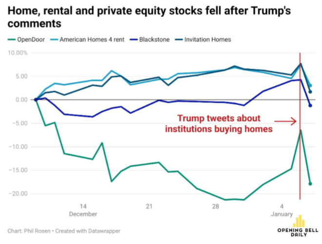 En vivienda, Trump apuntó a la compra corporativa de casas unifamiliares como factor que reduce oferta y encarece precios, y dijo que tomaría medidas inmediatas para prohibir que grandes inversionistas institucionales sigan adquiriéndolas, además de pedir al Congreso que lo convierta en ley: “la gente vive en casas, no las corporaciones”. El mercado volvió a castigar primero y preguntar después: cayeron arrendadores cotizados como Invitation Homes y American Homes 4 Rent, y también nombres vinculados al capital privado y al ecosistema inmobiliario como Blackstone y Opendoor. Aunque la propiedad institucional creció tras la crisis de 2008 y no domina el total del mercado, se volvió un símbolo político en un entorno de precios históricamente altos; la Casa Blanca no detalló el mecanismo de implementación, pero la lectura de corto plazo es clara: los inversionistas prefieren no esperar “claridad” cuando el riesgo regulatorio se comunica con esa contundencia y alcance. (OBD)