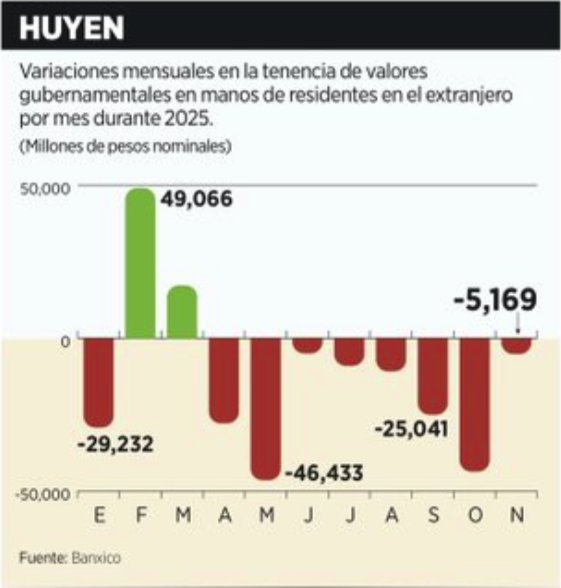 Entre enero y noviembre de 2025, los extranjeros se deshicieron de $136 mil millones de pesos en bonos del Gobierno mexicano. Siguen dentro, claro, con $1.7 billones todavía invertidos.