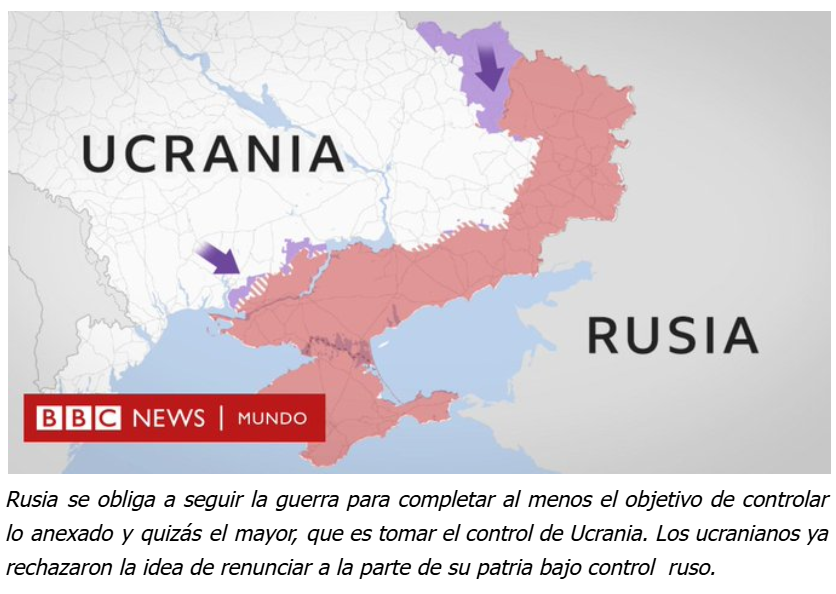 Desde el inicio de la invasión en febrero de 2022, Rusia logró ocupar 119,000 km² adicionales en Ucrania, sumando un total de 161,000 km² bajo su control si se incluyen las anexiones de 2014, lo que representaba el 27% del territorio ucraniano. Sin embargo, a partir de agosto de 2022, Ucrania lanzó una contraofensiva que logró recuperar 74,443 km², expulsando a las tropas rusas de regiones clave como Jersón y Járkov. Como resultado, la superficie ocupada por Rusia se redujo al 18.21% del territorio ucraniano, equivalente a 109,860 km², menor que la extensión capturada en 2022. En términos netos, desde el inicio de la invasión, Rusia consolidó un 11.21% adicional del territorio, pero perdió el 8.79%, reflejando el alto costo territorial de la guerra. Pese a esto, el 30 de septiembre de 2022, Putin decretó la anexión de los oblasts de Donetsk, Luhansk, Zaporiyia y Jersón, además de zonas de Járkov y Mykolaiv, convirtiéndolos legalmente en territorio ruso según la legislación del Kremlin. Este punto es crucial, ya que cualquier sucesor de Putin estaría obligado a ejercer autoridad sobre estas regiones, lo que significa que, salvo una ley que revierta la anexión, el conflicto continuará hasta que Rusia logre consolidar su control o modifique su estrategia.