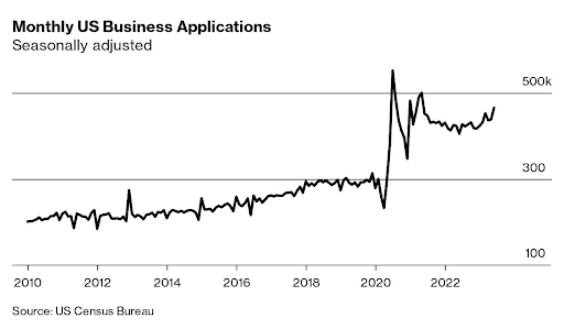 4. Las nuevas solicitudes de negocios se dispararon a más de 5 millones en 2022, un aumento del 42% con respecto a los niveles previos a la pandemia (BBG).