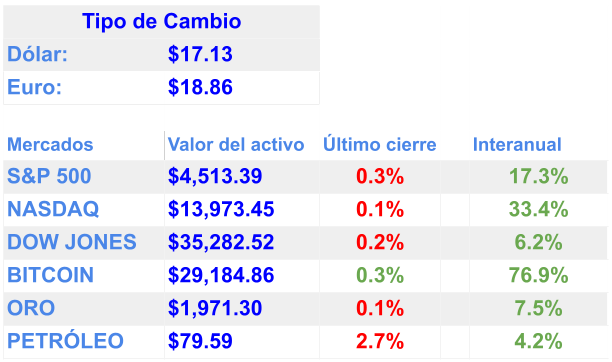 El banco central de China dijo que aumentaría el apoyo financiero para el sector privado / El Banco Central Europea (BoE) subió las tasas de interés nuevamente / El mercado laboral de Estados Unidos ha demostrado ser mucho más resistente de lo que la mayoría pensaba / El S&P cerró en números rojos ayer, los rendimientos de los bonos continuaron aumentando / Al parecer, DC no está muy preocupado por la rebaja de calificación de Fitch Ratings / Elon Musk es un gran admirador de los Treasury Bills / El expresidente acudió a la corte el jueves y se declaró inocente de los cargos de intentar anular los resultados de las elecciones de 2020 / Amazon tuvo un informe trimestral espectacular / Las reservas de Airbnb están más bajas de lo esperado/ Las aplicaciones de citas como Tinder y Bumble pronto podrían agregar funciones de Inteligencia Artificial y una revolucionaria "píldora que mata el cáncer", llamada AOH1996, ha demostrado un potencial notable en las primeras investigaciones al aniquilar de manera efectiva los tumores sólidos y al mismo tiempo preservar las células sanas.