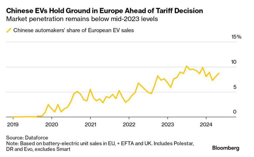 Las marcas chinas de automóviles eléctricos mantuvieron su participación en el mercado europeo de vehículos eléctricos en mayo, antes del anuncio de nuevos aranceles. Los fabricantes de automóviles como BYD representaron el 8,7% de las ventas totales de vehículos eléctricos, aproximadamente en línea con el año anterior, según el investigador Dataforce, mientras las empresas chinas presionan a sus homólogas europeas con modelos nuevos y económicos. (BBG)