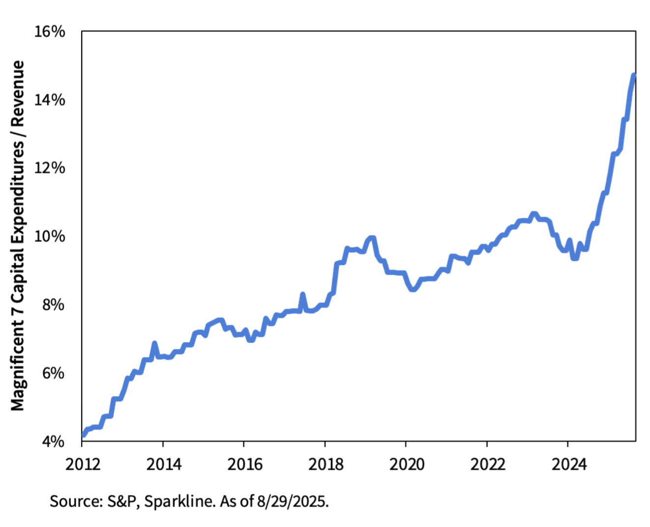 Las llamadas Magnificent 7 —Apple, Microsoft, Amazon, Meta, Tesla, Nvidia y Alphabet— están dejando atrás el modelo “asset-light” (basado en activos intangibles como software, propiedad intelectual, marcas o efectos de red, que requieren poca inversión física) que las convirtió en gigantes bursátiles para adoptar esquemas intensivos en capital. Sus gastos de capital pasaron de representar apenas 4% de ingresos en 2012 a 15% en la actualidad, con casos extremos como Meta, que planea destinar 35% de sus ventas a centros de datos y servidores, niveles comparables a los de una empresa de servicios públicos en Estados Unidos. Microsoft y Alphabet siguen la misma tendencia, con ratios de inversión sobre ingresos de 28% y 21%, respectivamente. La competencia por dominar la infraestructura de inteligencia artificial obliga a estas compañías a invertir sumas colosales que ya aportan de manera significativa al crecimiento del PIB estadounidense.