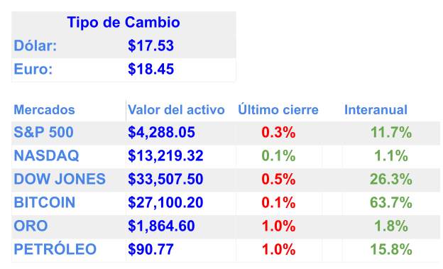 Los índices accionarios estadounidenses cayeron la semana pasada, los inversionistas asimilaban la noticia de un posible cierre del gobierno estadounidense / Joe Biden firmó un proyecto de ley para mantener abierto el gobierno durante el fin de semana / Londres está en camino de convertirse nuevamente en el mercado de valores más grande de Europa / Los estadounidenses siguen gastando como locos / Quiebras de pequeñas empresas están en aumento en Estados Unidos / Unos 28 millones de estudiantes en Estados Unidos deberán comenzar a pagar sus deudas este mes después de una pausa (por Covid) de tres años / El juicio civil por fraude a Donald Trump comienza hoy en Nueva York. El imperio inmobiliario del ex presidente está en juego y el juez que lo preside no tiene un historial comprensivo / Elon Musk, cuya red satelital Starlink ha sido vital para el esfuerzo de defensa de Ucrania, publicó ayer una imagen retocada de Zelensky en su plataforma de redes sociales X, ridiculizando las solicitudes de ayuda de Ucrania / Registra AMLO aprobación de 58% en septiembre, al arrancar su último año de gobierno. Tiene un índice de reprobación del 41% (Encuesta El Financiero) / Al menos nueve personas murieron y 40 resultaron heridas en el trágico accidente en una iglesia en México, Ciudad Madero, Tamaulipas / El cambio climático ha llevado a los mosquitos portadores de virus a lugares donde nunca antes se habían encontrado, informa el New York Times / A partir de hoy, los comités de Suecia y Noruega comenzarán a nombrar a las o los ganadores de los Premios Nobel / Los países ricos están importando una solución a su escasez de enfermeras, y los países pobres están pagando el precio y casi la mitad de los estadounidenses de 18 a 29 años viven con sus padres, el mercado inmobiliario está en el nivel más caro de su historia.