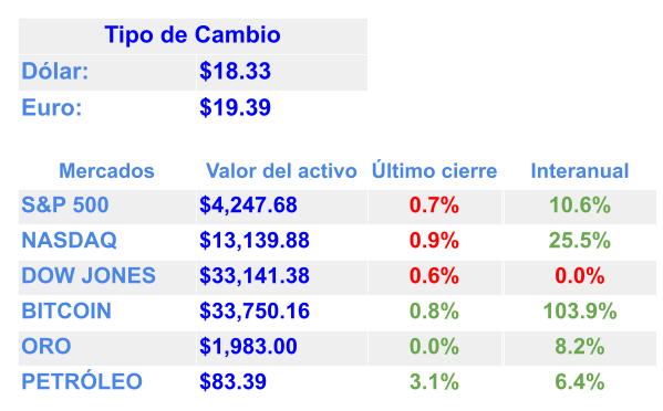 Los índices accionarios subieron ayer y el S&P 500 revirtió una caída de cinco días cuando varias empresas de tecnología informaron ganancias en sus informes trimestrales que fueron mejores de lo esperado / Los estadounidenses no han estado tan atrasados en los pagos de sus automóviles desde 1994. Los aumentos de las tasas de interés están encareciendo demasiado los préstamos / El presidente Recep Tayyip Erdoğan ha presentado la solicitud de adhesión de Suecia a la OTAN al parlamento para su ratificación después de meses de incertidumbre y negociaciones / El presidente Turco Erdogan dice que Hamás "no es un grupo terrorista" y la califica de "organización patriótica que defiende su territorio y a su pueblo" / Reporte sin verificar de un canal ruso de Telegram afirma que Putin usa regularmente un doble y recientemente sufrió un ataque cardíaco / México: Según la Ley de Ingresos de la Federación –uno de cada cinco pesos de ingresos públicos provendrá de la deuda el año que entra- / La candidata conservadora María Corina Machado ganó las elecciones primarias de la oposición en Venezuela para competir con el presidente venezolano Nicolás Maduro en las elecciones de 2024 / China está poniendo el mercado de vehículos eléctricos en jaque mate, al limitar las exportaciones de grafito, componente crítico para las baterías de estos autos / Unos 42 fiscales en Estados Unidos han unido fuerzas acusando a Meta (Nasdaq: META) de crear características adictivas en Facebook e Instagram que están causando estragos en la juventud / China ha abierto una investigación fiscal sobre el fabricante de tecnología taiwanés Foxconn (Casualmente el fundador de Foxconn, Terry Gou, se postulará para la presidencia de Taiwán en enero) / Chevron, la segunda compañía petrolera más grande de Estados Unidos, ha anunciado que comprará al productor estadounidense Hess por la friolera de 53.000 millones de dólares, el mayor acuerdo en la historia de Chevron y tanto Microsoft como Alphabet, matriz de Google, superaron las estimaciones trimestrales. Microsoft experimentó un gran crecimiento en su negocio de nube Azure, mientras que el crecimiento de los ingresos de Alphabet volvió a los dos dígitos, a pesar de un fracaso en su propio negocio de nube y la ya alarmante proliferación de imágenes de abuso sexual infantil en Internet podría empeorar mucho si no se hace algo para controlar las herramientas de inteligencia artificial que generan fotografías falsas.