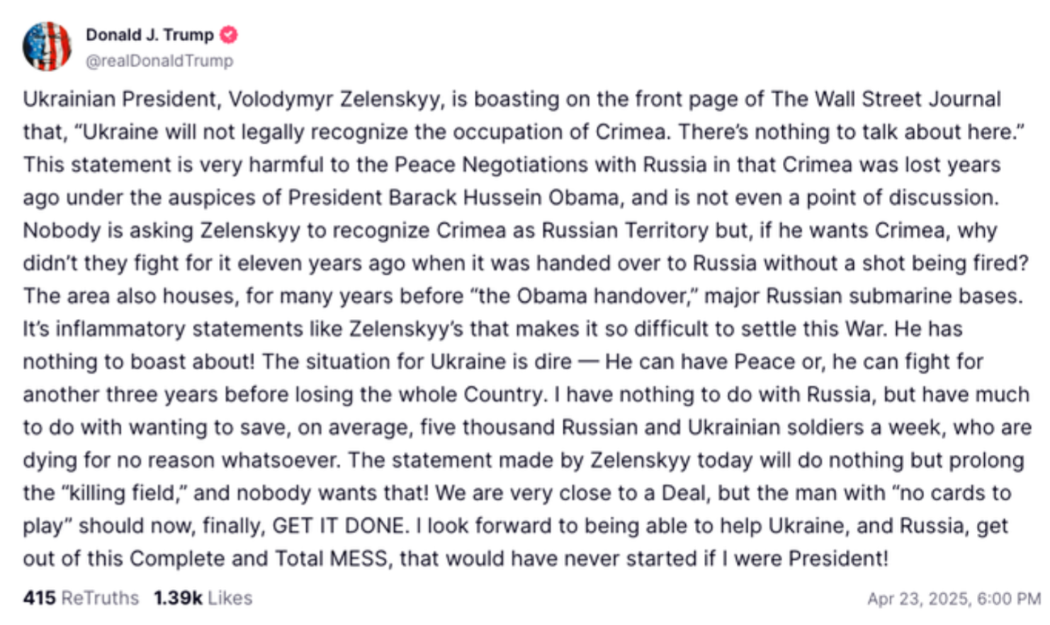 El presidente Trump arremetió contra el líder ucraniano, Volodímir Zelenski, por rechazar reconocer a Crimea —anexada por Rusia en 2014— como territorio ruso dentro de un posible acuerdo de paz. “Declaraciones incendiarias como las de Zelenski dificultan enormemente poner fin a esta guerra”, escribió Trump en redes sociales, acusándolo de prolongar el “campo de matanza”. Sus comentarios se produjeron luego de que las negociaciones de paz en Londres, promovidas por Estados Unidos, se estancaran tras la negativa de altos funcionarios estadounidenses a asistir, en respuesta al rechazo de Zelenski a los términos propuestos. Aun así, Trump insistió en que un acuerdo para poner fin al conflicto entre Rusia y Ucrania está “muy cerca”. (MB)