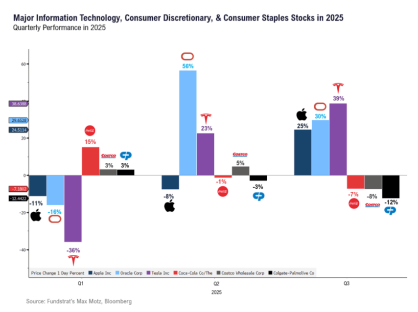 Muchos inversionistas parecen ignorar señales de recesión en Estados Unidos. El sector de bienes de consumo básico, tradicional refugio en tiempos de incertidumbre económica, es el único del S&P 500 que cerrará el trimestre en números rojos, con una caída de 3.2%. Compañías como Coca-Cola, Costco y Colgate-Palmolive muestran descensos de entre 7% y 12%. Este comportamiento contrasta con la fuerza del índice general, que avanza 7.1% impulsado por el rally tecnológico: Nvidia subió 13% tras anunciar inversiones millonarias en OpenAI e Intel, mientras que Intel se disparó 58% y Oracle captó atención con expectativas de ingresos de 300 mil millones de dólares gracias a la inteligencia artificial. En otras palabras, mientras los sectores defensivos pierden brillo, los inversionistas apuestan fuerte por la narrativa de innovación y crecimiento.