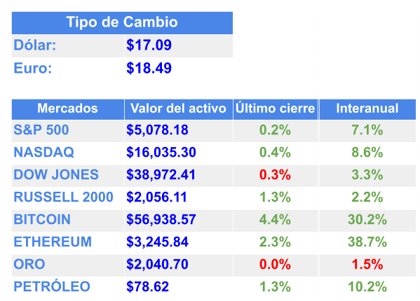 Las posibles justificaciones para el uso de armas nucleares tácticas rusas incluyen una invasión enemiga, la pérdida del 20% de sus submarinos con misiles balísticos estratégicos o la destrucción de mínimo tres aeródromos / Una de cada cuatro personas en Gaza, unas 575,000 personas, están al borde de la inanición, dijo la ONU, advirtiendo que la situación puede deteriorarse a medida que Israel continúa su ofensiva contra Hamás / Suecia está en camino a convertirse en el 32° miembro de la OTAN / Estados Unidos presiona para que se ponga fin a la guerra en Sudán / Trump y Biden ganan las primarias de Michigan / Chief Economist de Morgan Stanley señala que un “hard landing” está garantizado, prevalecen los riesgos geopolíticos y las altas tasas de interés / Las acciones estadounidenses subieron modestamente ayer mientras los inversionistas se preparaban para los datos clave de inflación que se publicarán a finales de esta semana / Las tasas de interés y la inflación están empezando a alcanzar a las empresas y a afectar sus ganancias / Bitcoin ha superado los $57,000 para alcanzar un máximo de 2 años / Inversionistas están cada vez más nerviosos por el auge del crédito privado en Estados Unidos / La OCDE recomienda a México elevar los ingresos tributarios / Alerta OCDE a México por la crisis de agua / La SEC acusó a un ex director ejecutivo de orquestar un “pump and dump” de “meme stocks” / Diez países alineados a occidente acaban de publicar seis principios compartidos para los sistemas de telecomunicaciones 6G / La tecnología “6G” nos ayudará a ampliar las aplicaciones existentes y emergentes, como hogares inteligentes, ciudades inteligentes, transporte automatizado, salud remota, entre otros / Apple da carpetazo a su ambicioso proyecto para construir un vehículo eléctrico después de una década de lento progreso / La salida de Apple muestra cuán competitivo se ha vuelto el mercado de vehículos eléctricos / Midjourney y OpenAI están comprando datos de Wordpress y Tumblr para fortalecer sus modelos de IA / BYD presentó un SUV híbrido de lujo que puede flotar en caso de caer al agua / Klarna, la startup fintech sueca está avanzando en sus planes para una oferta pública inicial (IPO) este año / Wendy's está invirtiendo 20 millones de dólares en menús digitales en todo Estados Unidos para implementar algunos cambios de alta tecnología en 2025. Entre las actualizaciones: precios dinámicos, cambios en el menú habilitados por IA y ventas sugeridas por algoritmo / El duopolio de medicamentos para bajar de peso Novo Nordisk-Eli Lilly se enfrenta a algunos competidores importantes. Las acciones de los fabricantes de medicamentos Viking Therapeutics y Zealand Pharma están subiendo esta semana gracias a los resultados positivos de los ensayos clínicos.