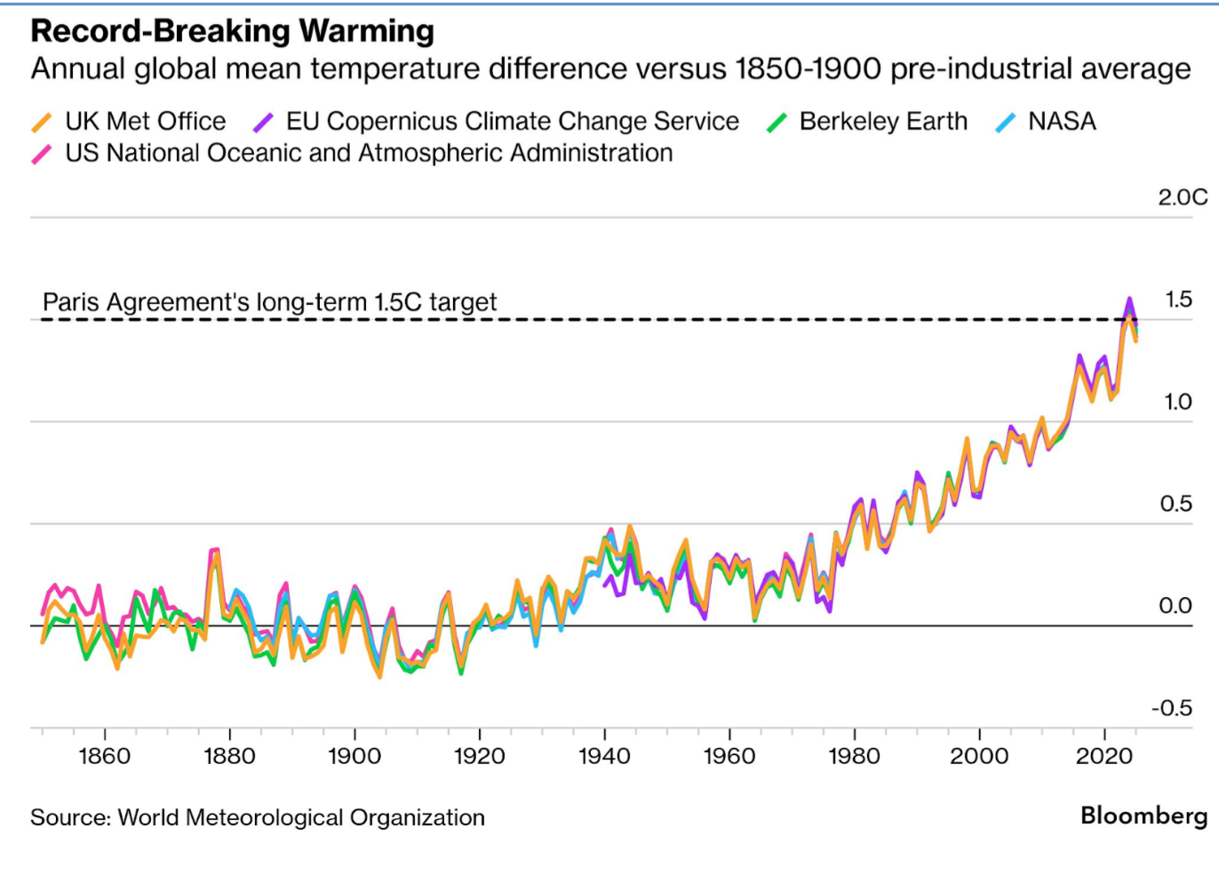 La temperatura media global ya supera de forma sostenida el umbral de 1.5 °C frente a la era preindustrial, el límite que el Acuerdo de París buscaba no rebasar.