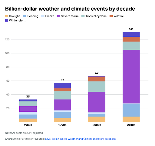 Desde 2013, ha habido 178 mil millones de dólares de eventos climáticos por un total de más de 1,2 billones de dólares. Incluso después de ajustar por inflación, eso representa un aumento de cinco veces tanto en el costo como en la frecuencia de los eventos de alto precio de los años 80.