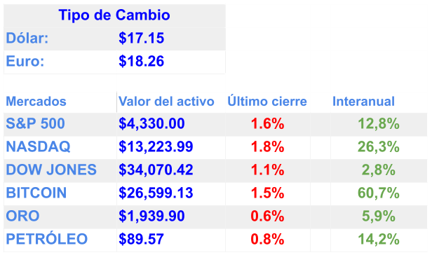 China está considerando flexibilizar las normas que limitan la propiedad extranjera en empresas nacionales que cotizan en bolsa para impulsar su mercado accionario / Después de supervisar el ciclo de ajuste monetario más agresivo en décadas, varios bancos centrales se mantuvieron quietos esta semana (mantuvieron sin cambios la tasa de interés), mientras hacían todo lo posible para convencer de que no estaban quitando el ojo de la inflación / Estados Unidos enviará tanques Abrams a Ucrania la próxima semana como parte de un paquete de ayuda / Zelenskyy visitará Canadá en busca de apoyo / Ucrania amenazó con demandar a Polonia, Hungría y Eslovaquia por su negativa a levantar una prohibición de importación de productos agrícolas ucranianos / Las tensiones entre India y Canadá están aumentando / Entre 2012 y 2022, los cárteles mexicanos sumaron a sus filas alrededor de 175 mil personas, según un estudio publicado en la revista Science / Los pasivos de Pemex con empresas proveedoras y contratistas se duplicaron en julio de 2022 / Se duplica la superficie nacional que padece sequía respecto a 2022 en México / CFE incrementó en 14.7% su generación de energía con combustibles sucios / Hardeep Singh Nijjar, líder de la comunidad sij y activista de derechos humanos en Columbia Británica (Canadá), fue asesinado a tiros en junio a los 45 años / AMLO no acudirá al Foro de Cooperación Económica Asia-Pacífico porque estará presente la mandataria de Perú, Dina Boluarte / Incremento del flujo migrante satura albergues en México y llega a una condición crítica en la Ciudad de México / Oleada africana a México con un crecimiento de hasta el 1,250% / Juan Collado fue liberado y usará brazalete / Las recientes Initial Public Offering (IPO) en el mercado bursátil han visto cómo sus acciones regresan a precios de oferta / Los rendimientos de los bonos del tesoro a 10 años alcanzaron un máximo de 16 años / Apple está otorgando aumentos menores a sus empleados minoristas y la demanda de la United Auto Workers (UAW) de una semana laboral de 32 horas pasó a un segundo plano en las conversaciones de negociación en Estados Unidos.