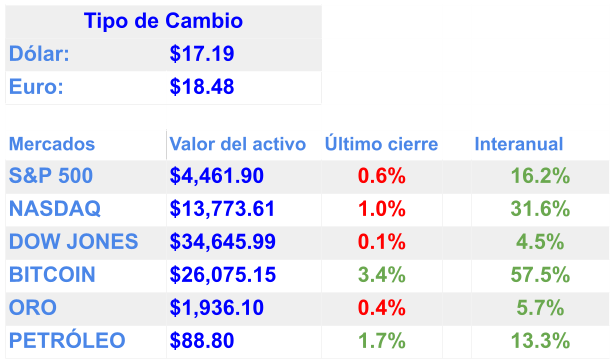 La fragmentación de la economía global en bloques separados sería “extremadamente costosa”, dijo la Organización Mundial del Comercio. / Los índices accionarios cayeron en su mayoría ayer mientras los inversionistas mostraban cierto nerviosismo por el aumento de los precios del petróleo y esperaban los datos clave de inflación de agosto. / Un nuevo informe de las autoridades taiwanesas afirma que China está intensificando las incursiones en la "zona gris" (actividades que son perjudiciales para Taiwán pero no actos de guerra per se). / El presidente de la Cámara de Representantes estadounidense, Kevin McCarthy, anunció ayer que la Cámara abrirá una investigación de juicio político contra el presidente Joe Biden por acusaciones de posible mala conducta financiera. / El presidente Gustavo Petro (Colombia) ha propuesto formar una alianza latinoamericana para abordar las drogas como una cuestión de salud. / El exsenador morenista Ricardo Monreal se bajó de la contienda electoral para competir por la Jefatura de Gobierno de la CDMX. / Google y el Departamento de Justicia de Estados Unidos iniciaron ayer un juicio antimonopolio de 10 semanas. El caso, acusa a la empresa de monopolizar ilegalmente las búsquedas en Internet. / Meta's Threads está bloqueando las búsquedas relacionadas con el covid en medio de un aumento en las infecciones, diciendo que temporalmente no proporcionará resultados que puedan contener "contenido potencialmente sensible". / Apple presentó sus iPhones más nuevos, destacando el iPhone 15 Pro, un modelo de titanio que puede capturar video espacial. / TikTok Shop ahora está disponible en los Estados Unidos, lo que significa que los más de 150 millones de usuarios estadounidenses de la aplicación ahora pueden comprar productos directamente de sus creadores favoritos. / El último sabor misterioso de Coca-Cola ya está aquí. La marca utilizó IA para desarrollar el sabor y el empaque de su nueva cola Y3000 de edición limitada. / Se teme que unas 5.300 personas en el noreste de Libia hayan muerto y miles más estén desaparecidas en medio de las devastadoras inundaciones causadas por las históricas lluvias de la tormenta mediterránea Daniel el domingo. / Científicos no pueden descifrar las misteriosas luces en el cielo justo antes de que un devastador terremoto azotara Marruecos.