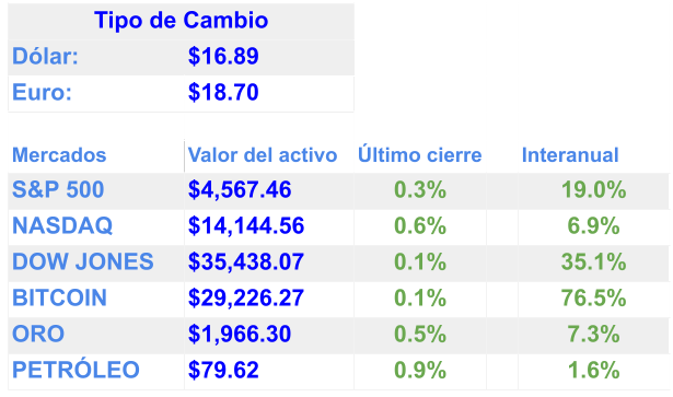 Los economistas están recortando las previsiones del PIB para China hasta bien entrado el próximo año / Los índices accionarios subieron liderados por informes trimestrales positivos de empresas tecnológicas / La Fed se prepara para subir las tasas a un máximo de 22 años hoy (los inversionistas esperan que está sea la última subida) / Se profundizó una venta masiva que sacudió los mercados israelíes, con acciones, bonos y la moneda cayendo a raíz de la nueva ley que resta facultades al poder judicial / El presidente de la Cámara de Representantes de los Estados Unidos, Kevin McCarthy, envió su señal más fuerte hasta el momento de que los republicanos podrían iniciar una investigación de juicio político contra Biden / Acuerdos secretos con Rusia ayudan a Kim Jong Un (Corea del Norte) a financiar programa nuclear / Legisladores rusos votaron para elevar la edad de servicio militar obligatorio de 27 a 30 años, ampliando el número de hombres que pueden unirse al ejército de Rusia por un año de servicio obligatorio / Los precios mundiales de los granos podrían subir hasta un 15%, dijo el economista jefe del FMI / Luis Rubio: Hay factores que, de conjugarse, podrían crear una crisis en el 2024 en México: “Presupuesto, distorsionado por clientelismo" de AMLO aseguró el presidente de “México Evalúa” / Incendios están ardiendo en Francia, España, Turquía, Croacia y, básicamente, en cualquier país mediterráneo / El Mediterráneo se está calentando un 20% más rápido que el resto del mundo. Ahora está en su punto más alto del que haya registro / Warren Buffett compró acciones energéticas a precios bajos / Las acciones de Google y Microsoft están subiendo vertiginosamente gracias a la “carrera” de Inteligencia Artificial / TikTok está lanzando un negocio de comercio electrónico en los Estados Unidos y el mercado de viviendas de lujo estadounidense se está desacelerando.