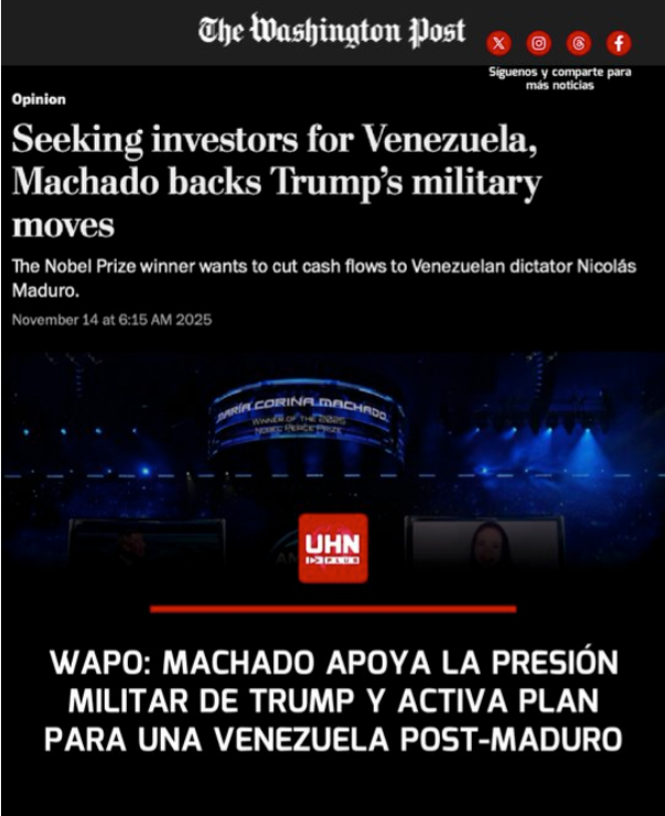 The Washington Post revela que María Corina Machado respalda la presión militar de Donald Trump sobre Maduro mientras presenta a inversionistas un ambicioso plan para reconstruir Venezuela “el día uno”, con apertura de mercados, privatizaciones y garantías plenas a la inversión extranjera.