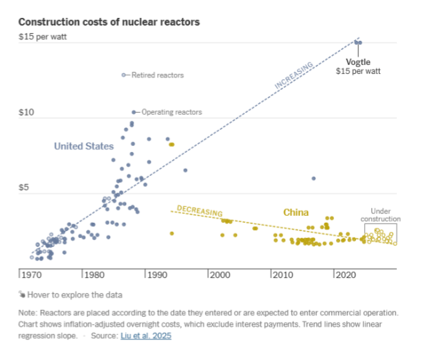 El contraste con Occidente es marcado. Estados Unidos, que alguna vez lideró la energía nuclear, ahora confía en la innovación privada y en reactores modulares más pequeños, financiados en parte por gigantes tecnológicos como Google, Amazon y OpenAI. Sin embargo, la fragmentación de diseños, la falta de infraestructura y los altos costos mantienen rezagado su progreso frente al modelo chino, más centralizado y eficiente. Pekín no solo busca asegurar su propia transición energética, sino dominar el mercado global de exportación de reactores, posicionándose como potencia nuclear civil en un siglo definido por la competencia energética entre superpotencias. (NYT)