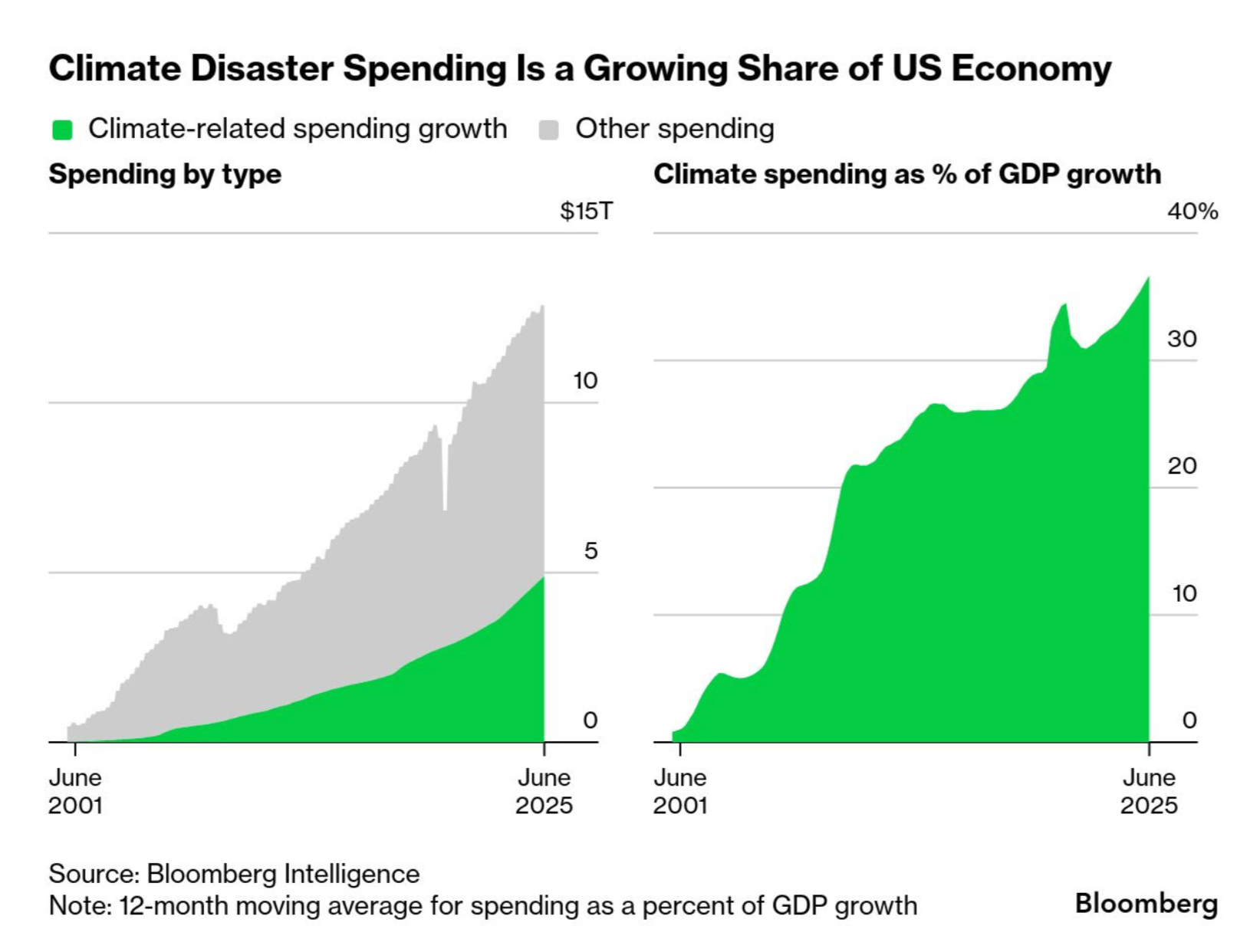 El fenómeno ilustra cómo la economía estadounidense está evolucionando hacia una dependencia estructural del gasto climático: la reconstrucción, las aseguradoras y los programas de emergencia representan ya una proporción creciente del crecimiento del PIB. Y mientras tanto, el resto del mundo atraviesa una dinámica similar: Europa enfrenta incendios y sequías récord, China sufre inundaciones devastadoras y América Latina padece pérdidas agrícolas históricas. El cambio climático ya no es un riesgo ambiental futuro, sino una fuerza económica global que reconfigura presupuestos, cadenas de suministro y modelos de crecimiento en casi todos los continentes. (BBG, y diversas fuentes)