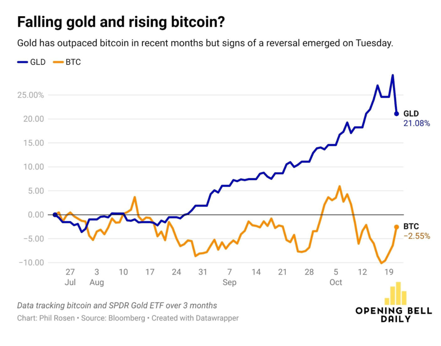 Los inversionistas parecen estar girando abruptamente de oro hacia bitcoin, marcando una posible “gran rotación” entre los dos activos duros. Tras un año histórico en el que el oro ha ganado más de 50% —su mejor desempeño en medio siglo—, bitcoin había quedado rezagado con apenas 22% de avance. Sin embargo, el martes ambas curvas se cruzaron repentinamente, sugiriendo un cambio de tendencia. Anthony Pompliano, cofundador de Opening Bell Daily, ya había anticipado que bitcoin tiende a seguir los movimientos del oro con un desfase de unos 100 días, y que esta podría ser la antesala de un rally explosivo hacia fin de año.