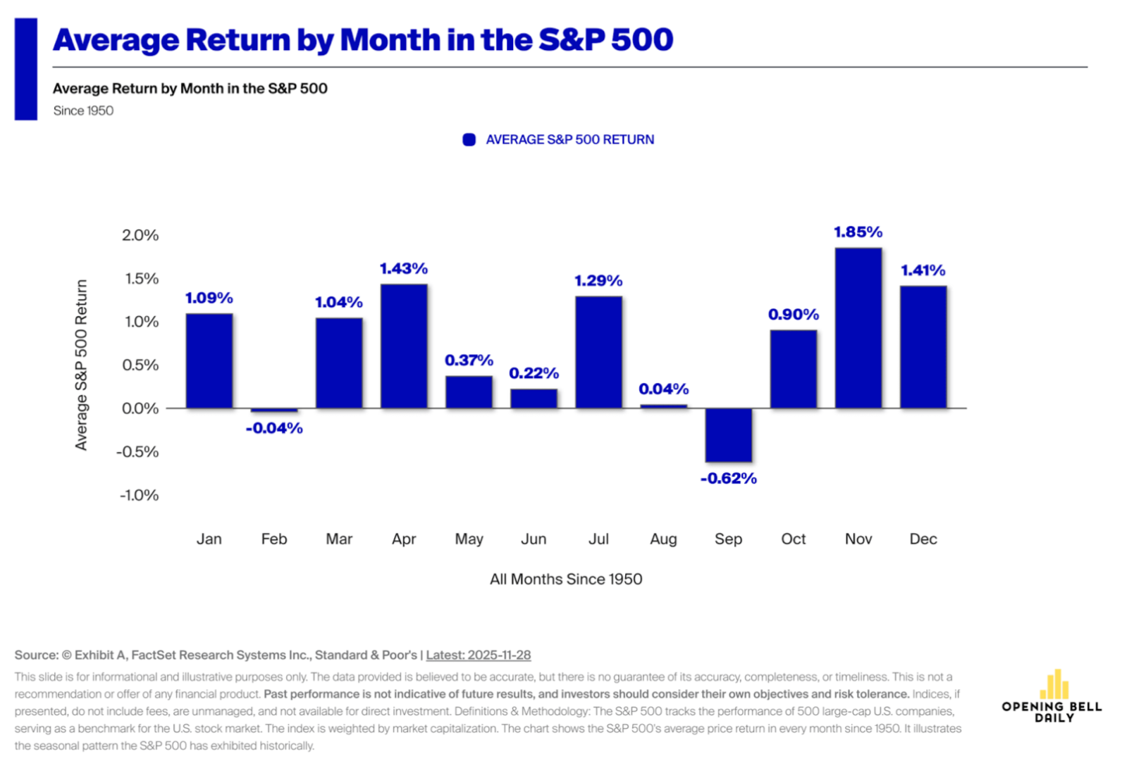Diciembre suele ser un mes positivo para las bolsas, pero este año los factores estacionales y políticos apuntan a un escenario particularmente optimista. Cuando el S&P 500 llega a diciembre con ganancias acumuladas, el índice suele subir en 81% de los casos, y en los años de inicio de ciclo presidencial esa cifra ha sido históricamente de 100%, con alzas promedio superiores al 2%. Ocho de los once sectores del S&P tienden a cerrar el mes con ganancias, encabezados por servicios públicos, industriales y financieros, mientras que las semanas finales concentran la mayor parte del repunte asociado con el llamado “rally de Santa Claus”.