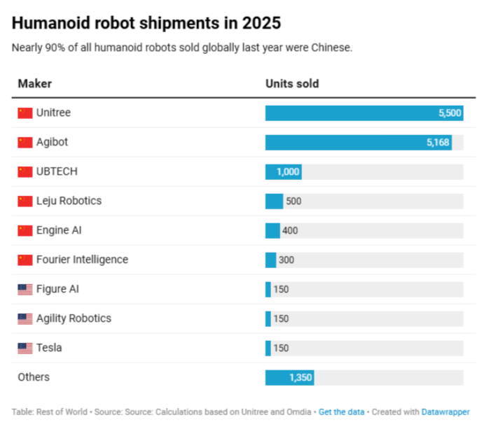China ya está replicando en robots humanoides la estrategia que le dio ventaja global en vehículos eléctricos: política industrial activa, financiamiento público, cadenas de suministro maduras y rápida capacidad de escalamiento. El resultado es contundente: cerca de 90% de los robots humanoides vendidos en 2025 provinieron de empresas chinas, con fabricantes como Unitree (empresa china enfocada en robots humanoides y cuadrúpedos de bajo costo y producción masiva) y Agibot (firma china de robots humanoides orientados a aplicaciones industriales) muy por delante en volumen frente a sus competidores occidentales. Aunque el mercado aún es incipiente y hoy se concentra en investigación, industria y comercio, las proyecciones apuntan a adopción masiva hacia finales de la década de 2030 y a un mercado de billones de dólares a mediados de siglo.