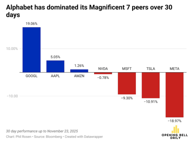 El repunte bursátil de Alphabet (holding de Google) confirma que, para Wall Street, Google ha recuperado el liderazgo en la carrera de la inteligencia artificial. Tras meses en los que muchos tecnólogos daban por hecho que OpenAI o Microsoft marcarían la pauta, el lanzamiento del modelo Gemini 3 —más sólido que ChatGPT en pruebas de referencia— y la mejora de sus herramientas creativas revitalizaron la narrativa en torno a la empresa. Desde septiembre, las acciones de Alphabet se han despegado con fuerza del resto de las grandes tecnológicas: acumulan un retorno cercano al 82%, superando con amplitud incluso a Nvidia. En un mes particularmente difícil para el sector, Alphabet avanzó casi lo mismo que Meta perdió, mientras Nvidia, Microsoft y Tesla registraron retrocesos.
