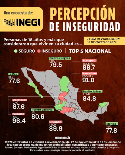 PERCEPCIÓN, Y... El Inegi reportó que la población de México estaría teniendo la percepción de inseguridad más baja de los últimos 10 años, al menos en el ámbito urbano. Esto según la última Encuesta Nacional de Seguridad Pública Urbana. Las ciudades más inseguras: Fresnillo, Zacatecas con 96.4 %; Naucalpan, Estado de México, con 91.0 %; Uruapan, Michoacán, con 89.9 %; Ecatepec de Morelos, Estado de México, con 88.7 %; Zacatecas, con 87.6 %; y Cuernavaca, Morelos, con 85.7%. (CON)