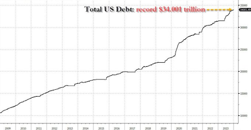 La deuda total de Estados Unidos acaba de superar los 34 billones de dólares, lo que significa que la deuda ha aumentado: