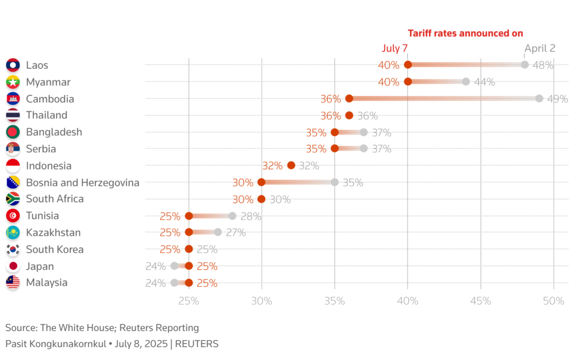 El presidente Trump envía más "cartas arancelarias" con las siguientes tasas arancelarias anunciadas hoy: