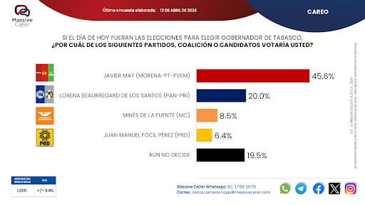 Encuesta El Universal en Guadalajara, Jal. Chema Martínez (Morena-PT-Verde y otros) 34.2%; Verónica Delgadillo (MC) 30.2% y Diana González (PAN-PRI-PRD) 11%. (UNI)