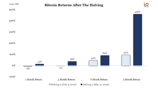 He aquí un vistazo a los rendimientos de bitcoin después de los dos eventos anteriores de Bitcoin Halving, que ocurren cuando los incentivos para los mineros de bitcoin se reducen a la mitad y tienen lugar cada 210.000 bloques o aproximadamente cada cuatro años.