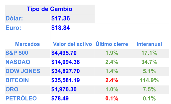 Los índices accionarios estadounidenses subieron ayer gracias a un informe positivo del IPC (Índice de Precios del Consumidor) de octubre, que mostró que la inflación cede y da esperanzas de que la Reserva Federal termine su ciclo de subidas de tasas de interés / Los legisladores en Estados Unidos, aprobaron ayer un proyecto de ley de gasto provisional que extendería la financiación gubernamental hasta 2024 / Al menos 40 pacientes han muerto en el hospital al-Shifa de Gaza, según el Ministerio de Salud dirigido por Hamás, mientras las Fuerzas de Defensa de Israel ingresan a las instalaciones en medio de combates con Hamás / Los funcionarios israelíes afirman que Hamás está utilizando el edificio como centro de mando / La Casa Blanca está cada vez más frustrada con la conducta de Israel en la guerra contra Hamas a medida que aumenta el número de muertes de civiles en Gaza y los llamados de la Washington no son atendidos, ampliando una brecha diplomática con los aliados en la región / Justin Trudeau se enfrenta a llamados para que renuncie como primer ministro de Canadá, incluso por parte de incondicionales de su propio partido político, a medida que crece la ira de los votantes por la vivienda y la inflación y las encuestas de opinión muestran un apoyo cada vez menor / El Ministro de Defensa Alemán ha dicho que la Unión Europea (UE) no podrá cumplir su promesa de enviar un millón de proyectiles de artillería a Ucrania para marzo, el problema no es la falta de producción, sino que los países la están exportando a otros lugares / El presidente brasileño, Luiz Inácio Lula da Silva, respaldó al argentino Sergio Massa antes de las elecciones presidenciales argentinas del domingo, el último líder que tomó partido en una contienda que ha puesto de relieve las cada vez más profundas divisiones ideológicas de América Latina / El Instituto Nacional de Estadísticas y Censos de Argentina informó que ese país alcanzó una inflación interanual de 142.7% / Millones de familias enfrentan la ruina financiera debido a los costos de atención a largo plazo para personas mayores, informa el New York Times / Los hombres tienen ahora su esperanza de vida más baja desde 1996. La brecha cada vez mayor entre hombres y mujeres se ha ampliado por la covid y las sobredosis de drogas, que son más probables en los hombres / Los ingresos de ByteDance crecieron a 29 mil millones de dólares en el segundo trimestre, lo que colocó al propietario chino de TikTok a poca distancia de Meta / Nepal es el último país en prohibir TikTok, alegando que la aplicación de redes sociales estaba alterando la “armonía social” / YouTube anunció una nueva política que requiere que los creadores etiqueten videos que contengan contenido generado por IA y el cambio climático le está costando a la economía estadounidense 150 mil millones de dólares al año.