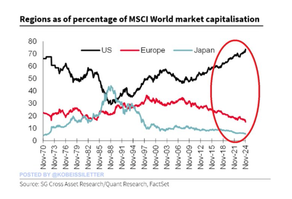 Como resultado, la participación de Estados Unidos en la capitalización del mercado global es ahora 4 VECES mayor que la de Europa y Japón COMBINADOS.