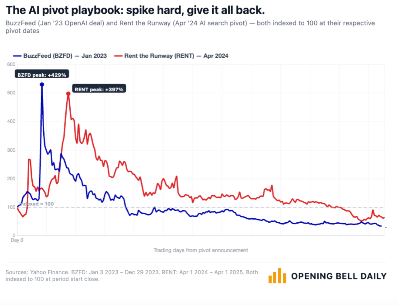 Los antecedentes recientes obligan a tomar distancia. BuzzFeed (medio digital) y Rent the Runway (plataforma de renta de ropa de diseñador) también vivieron repuntes bursátiles tras incorporar el discurso de inteligencia artificial, pero en ambos casos esas ganancias se evaporaron en cuestión de meses. Frente a ellas, firmas como CoreWeave (empresa que renta capacidad de cómputo especializada para inteligencia artificial a otras compañías) sí han construido infraestructura real y escala en ese mercado. La lección es clara: Wall Street sigue premiando la promesa de inteligencia artificial en el corto plazo, pero tarde o temprano exige lo de siempre: ejecución, credibilidad y un negocio que realmente funcione. (OBD)