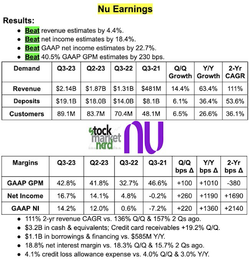 NU agregó otros 5,4 millones de clientes en el tercer trimestre, ahora tiene 89 millones de clientes con un ingreso promedio mensual de $10 dólares y con clientes más antiguos que alcanzan los $26/mes. Tienen una sólida estrategia a largo plazo y estamos en un punto de entrada muy bueno creado por las recientes correcciones en el precio de las acciones por el ambiente de tasas de interés tan altas.