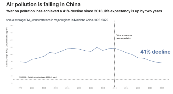 La guerra de China contra la contaminación del aire ha dado “excelentes” resultados. Desde que el gobierno lanzó su iniciativa multimillonaria para reducir la contaminación en 2014, los niveles generales de contaminación por partículas han disminuido un 41%. En la región de Beijing-Tianjin-Hebei, la más contaminada de China continental, los niveles de partículas se redujeron en un 45% entre 2014 y 2022. Gracias a estas mejoras, se espera que el ciudadano chino promedio viva dos años más.