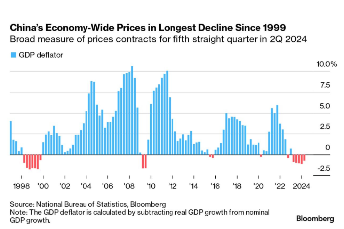 China está lidiando con una crisis de deflación. La inflación subyacente está avanzando al ritmo más lento en más de tres años y los precios de fábrica siguen estancados en la deflación, como lo han estado desde finales de 2022. La medida más amplia de precios, el deflactor del PIB, ha caído durante cinco trimestres y ese tramo probablemente se extenderá hasta 2025, dice Bloomberg Economics. (BBG)