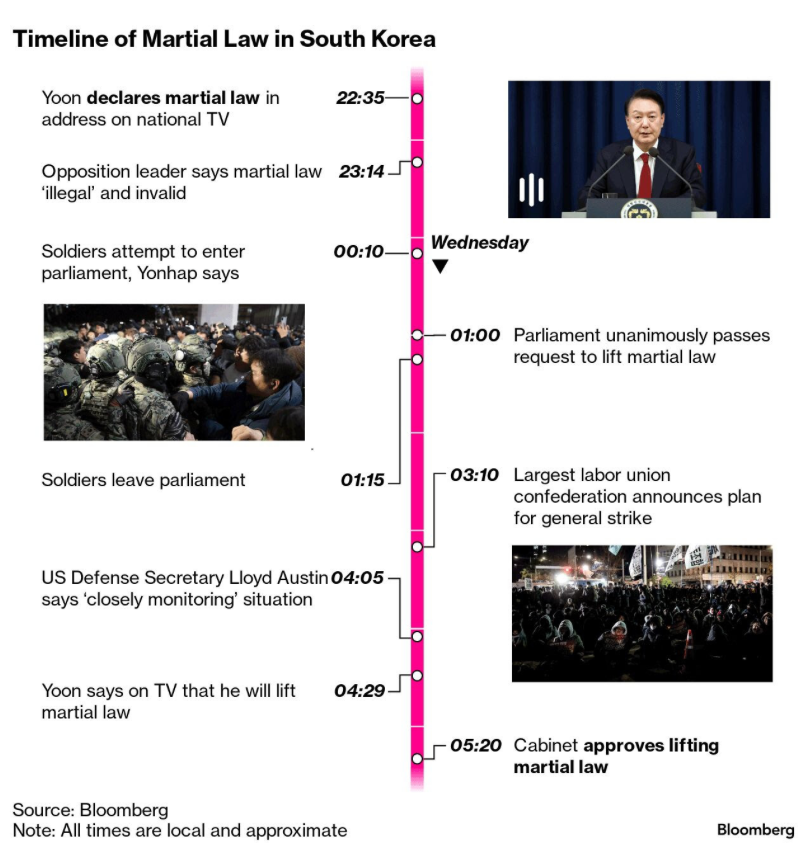 La breve imposición de la ley marcial en Corea del Sur por parte del presidente Yoon Suk Yeol generó una rápida reacción de los mercados globales, con caídas iniciales de hasta el 7% en el ETF de Corea del Sur y una depreciación del won del 3% frente al dólar. Tras el rechazo del parlamento y la revocación de la medida horas después, las acciones coreanas y la moneda lograron recuperarse parcialmente, mientras el S&P 500 y el Nasdaq alcanzaron nuevos máximos históricos. (OBD)