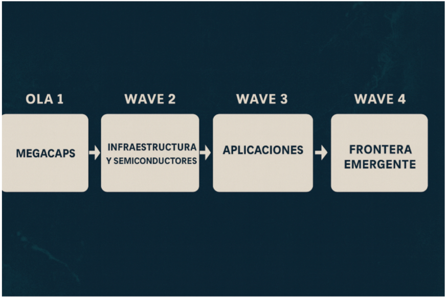 En este orden, la inteligencia artificial no se mueve en una sola dirección, sino en etapas de inversión que suelen desplegarse en “olas”. La primera ola —la que hemos vivido en los últimos dos años— está dominada por las megacaps tecnológicas (NVDA, MSFT, AMZN, GOOGL, AAPL), cuyos múltiplos bursátiles se han inflado al ritmo del entusiasmo global por la IA. Sin embargo, si la Reserva Federal inicia un ciclo de recortes de tasas, es probable que veamos un roll over: una rotación de capital desde los gigantes hacia medianas y pequeñas capitalizaciones que forman parte de las siguientes etapas. Estas últimas se benefician de forma desproporcionada cuando cae el costo del dinero, porque muchas cargan con deudas más onerosas y cotizan con múltiplos deprimidos. La amplitud del mercado ya comienza a reflejar este cambio: los inversionistas buscan alternativas más allá de los “titanes” de la primera etapa.