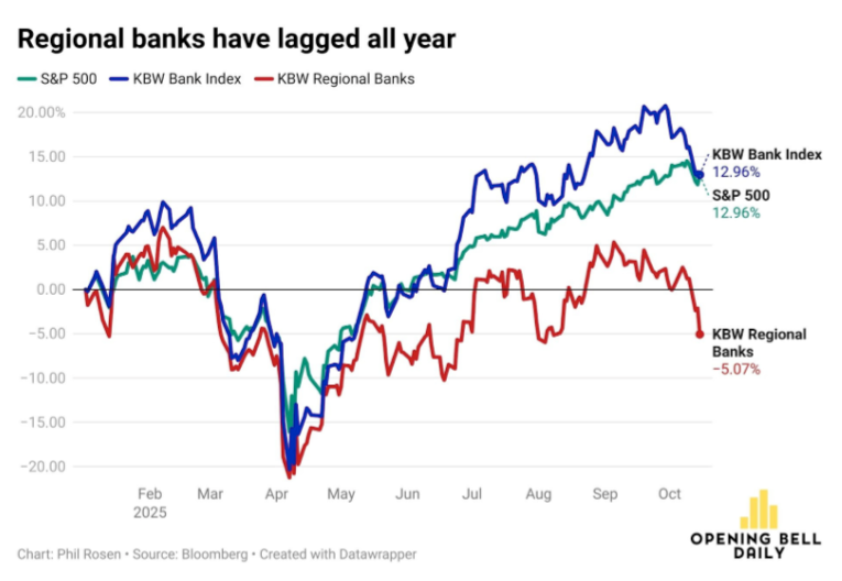 Las acciones de los bancos regionales en Estados Unidos registraron su peor jornada frente al S&P 500 desde 2023, reavivando los temores de una nueva crisis financiera similar al colapso de Silicon Valley Bank (una institución con fuerte exposición a startups tecnológicas y bonos de largo plazo que quebró en marzo de 2023 tras una corrida bancaria provocada por pérdidas en su cartera de inversión). El desplome se originó tras los reportes de Zions Bancorp, que tuvo que cancelar 50 millones de dólares en préstamos incobrables, y Western Alliance, que admitió haber demandado a un cliente por fraude. Ambas acciones cayeron más de 10% en un solo día, arrastrando al índice KBW Regional Banking a una pérdida de 6.3%, su peor desempeño relativo desde marzo de 2023.