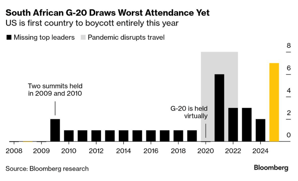 La fragilidad del foro invita a preguntarse por su futuro: el próximo encuentro será en el Doral Resort de Trump en Miami y queda por ver quién será invitado y quién boicoteará. La paradoja es evidente: el mismo Trump que tuvo que descartar en 2019 la idea de organizar el G-7 en una de sus propiedades, hoy puede imponer su propia arquitectura diplomática ante un G-20 debilitado. Lo que alguna vez fue un mecanismo crucial para evitar una nueva Gran Depresión se ha convertido en una estructura hueca, incapaz de proyectar unidad o liderazgo global. (BBG)